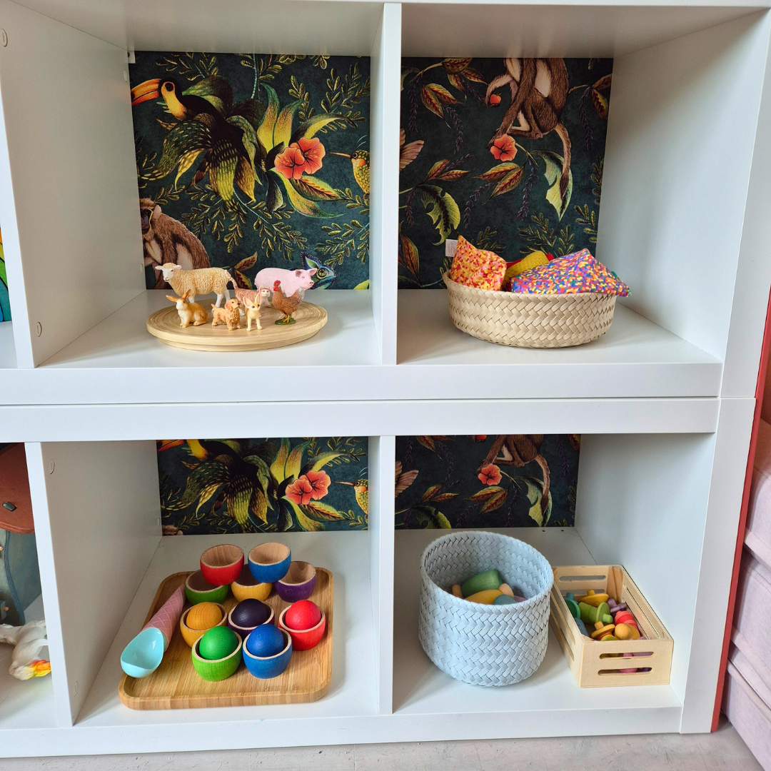 These baskets are fantastic for displaying toys invitingly in an open toy cupboard. The basket itself is self-explanatory. But you can also use the lid to display toys. When you flip the lid over, it becomes a super handy tray for placing toys. And the top of the lid doubles as a stage for the toy cupboard. See the photos for inspiration for inviting toy displays.